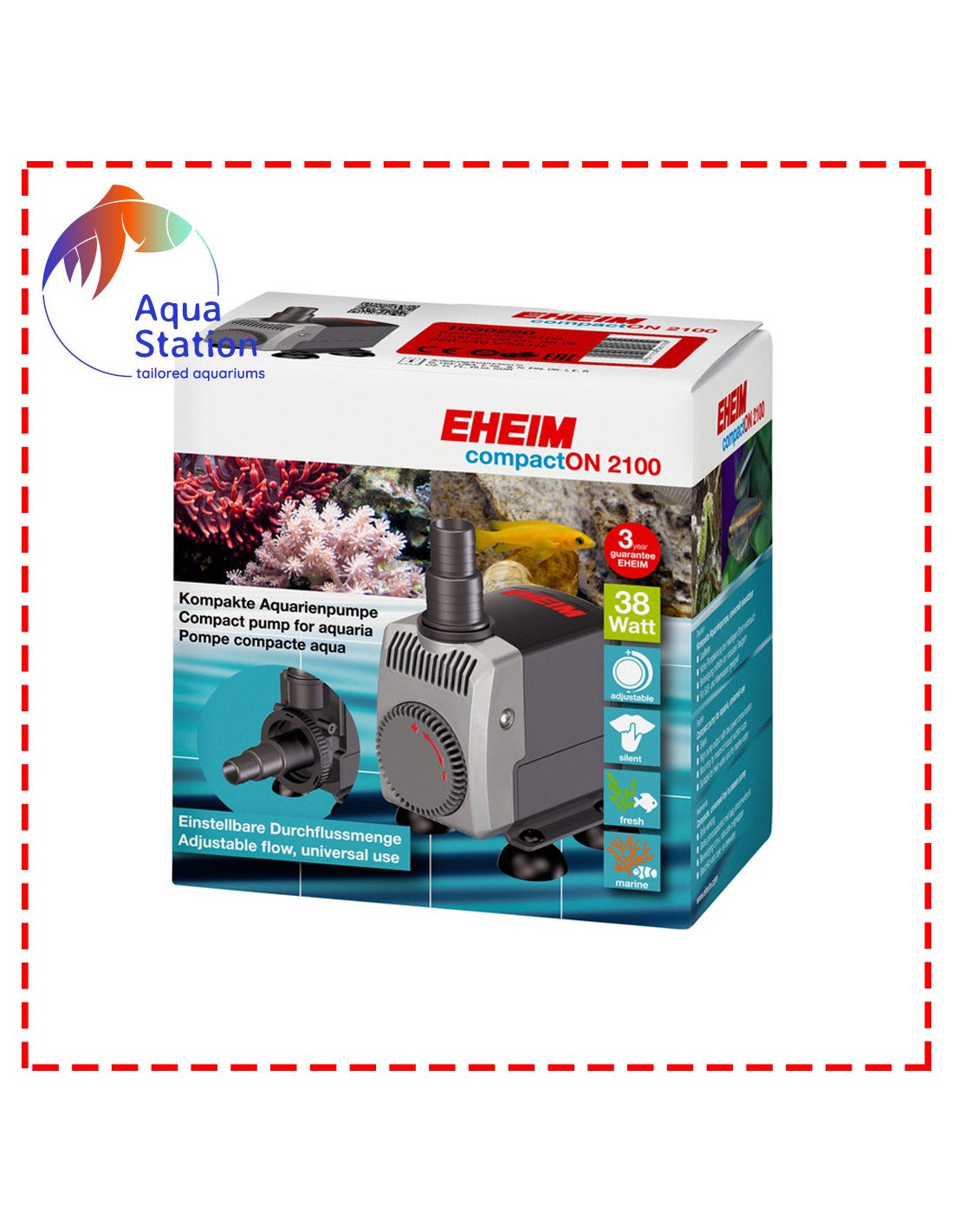 A bomba de aquário EHEIM compactON é caracterizada por seu nome através de um design compacto e é graças à bolsa de acessórios incluída apropriada para uso versátil - as bombas EHEIM compactON 2100-12000 podem ser modificadas para o uso fora da água. Graças ao material de alta qualidade também é possível usá-las, sem problema, em água marinha.