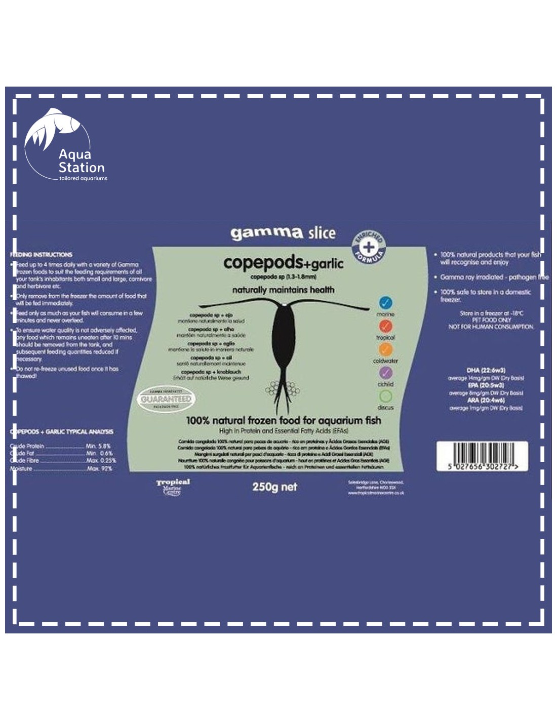 - Gama irradiada. Isso elimina completamente qualquer risco de introduzir parasitas ou bactérias prejudiciais em seu aquário, e também significa que o alimento é completamente seguro de armazenar em seu freezer.
