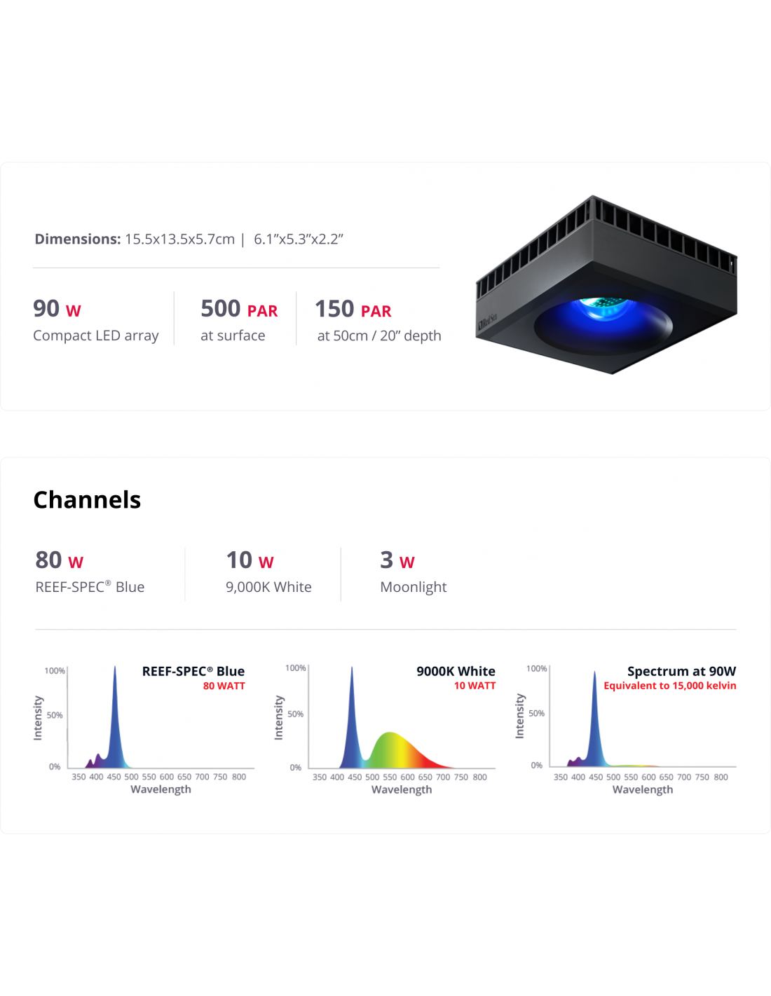 Em cada unidade encontra-se um único e compacto conjunto de LEDs, que inclui 23.000 Kelvin REEF-SPEC Blue (uma mistura proprietária de LEDs azuis, violetas e ultravioleta), juntamente com 9.000 Kelvin White e um canal de 3W separado para o luar. Este conjunto permite uma ampla gama de luz REEF – SPEC que o vai agradar a si e aos seus corais.