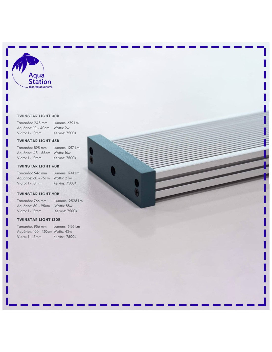 | Modelo | Aquários | Dimensões | Espessura Vidro | Lúmens | Watts | Leds | |
