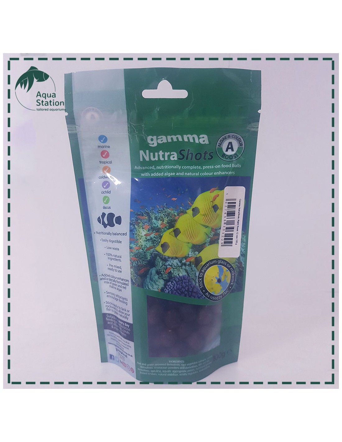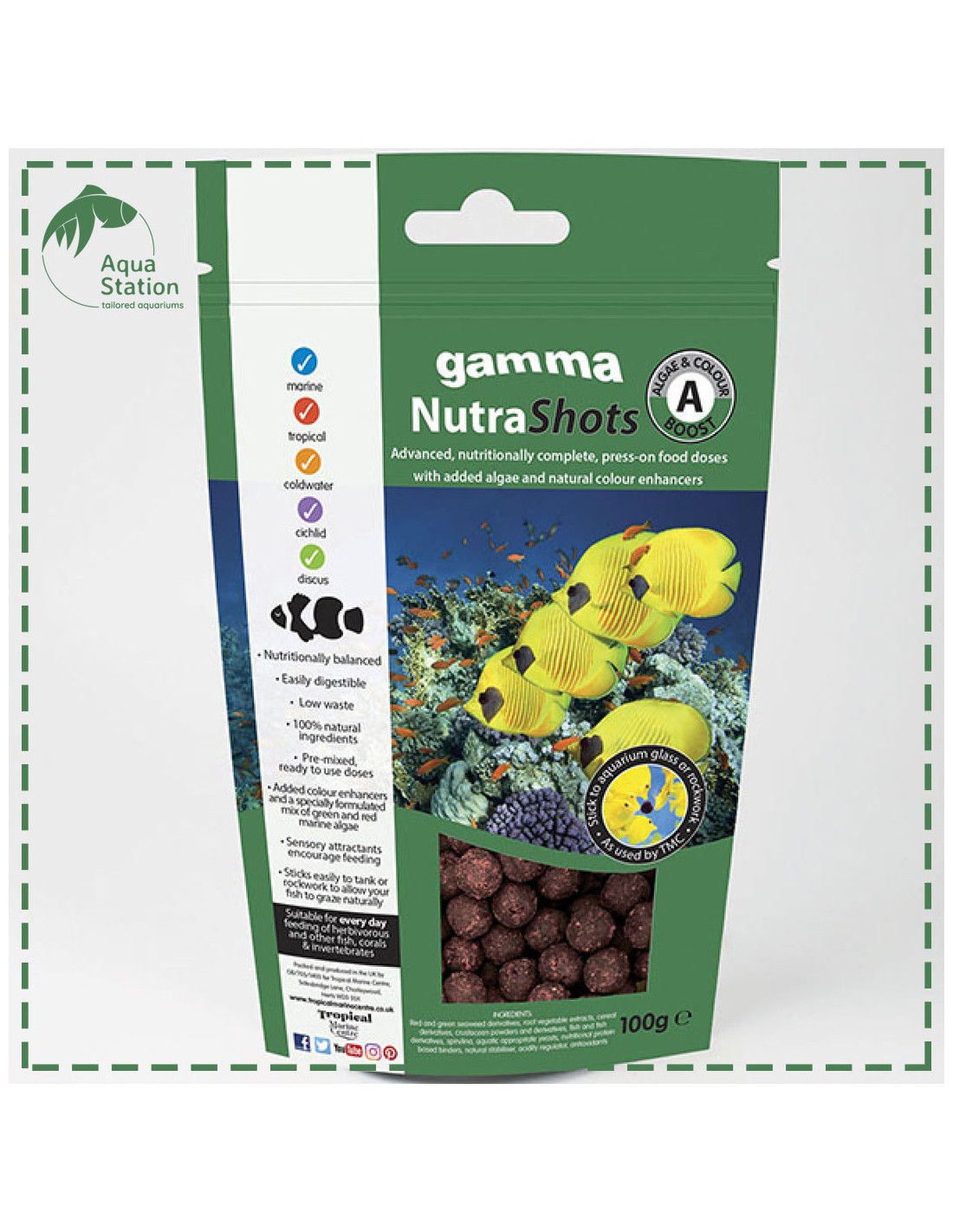 Gamma NutraShots são pré-misturados prontos para usar bolas de alimentos projetadas para enriquecer o ambiente animal e estimular respostas naturais da alimentação. Grude o alimento e coloque junto ao vidro permitindo que o seu peixe se alimente facilmente. Contem intensificadores de cor e uma mistura especialmente formulada de algas marinhas verdes e vermelhas. Adequado para alimentação diária de herbívoros e outros corais de peixes e invertebrados. Use em conjunto com gamma Nutra Complete Vitality Boost e Feeds Líquidos, bem como Gamma Frozen e Gamma Dry Foods para fornecer uma dieta variada e manter seu peixe em ótimas condições.