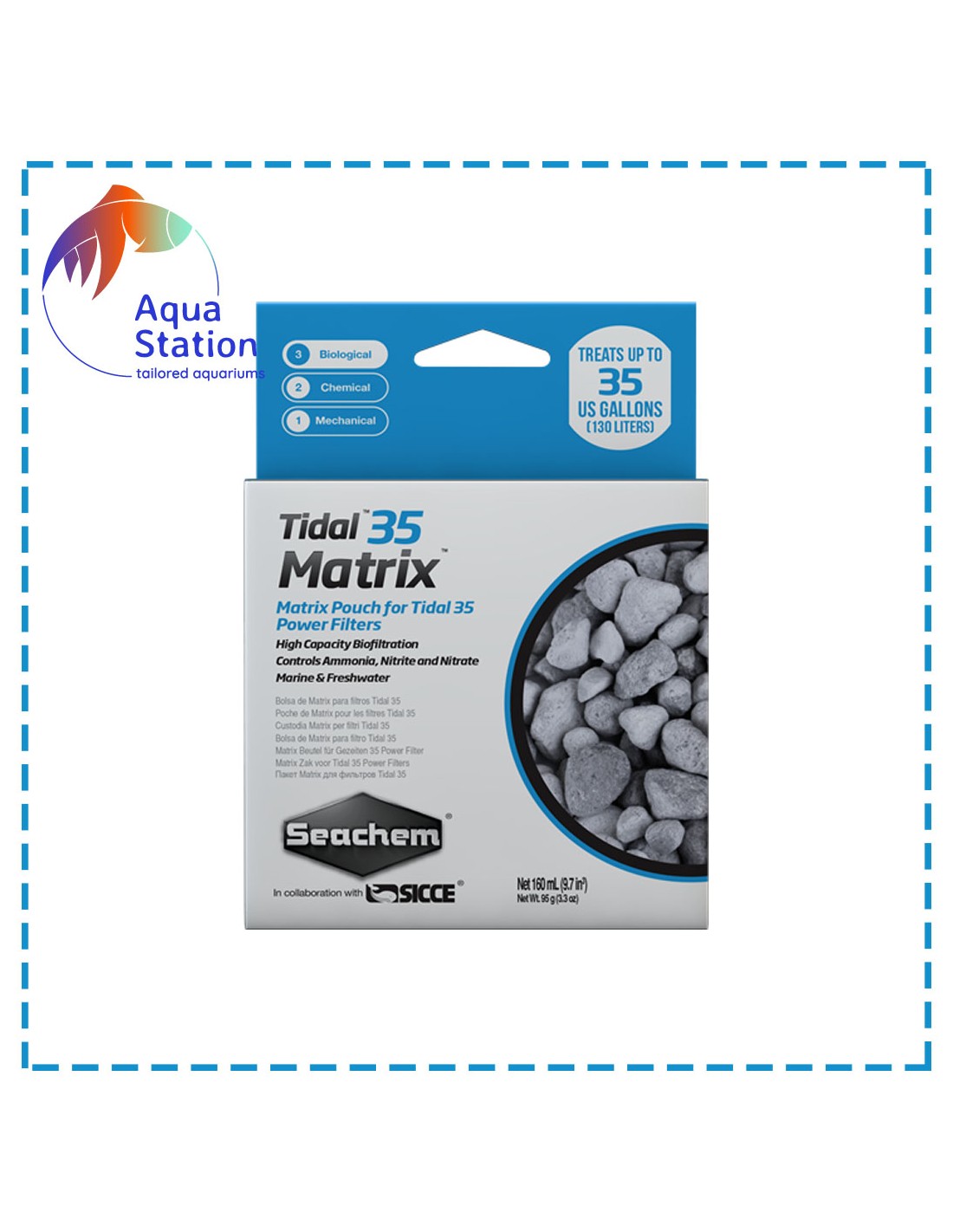 As bolsas de bio-media Tidal Matrix contêm quantidades precisas (250 ml, 350 ml ou 500 ml) de meio de filtro Seachem Matrix, distribuídos especificamente para uso em filtros de energia de maré Seachem.
